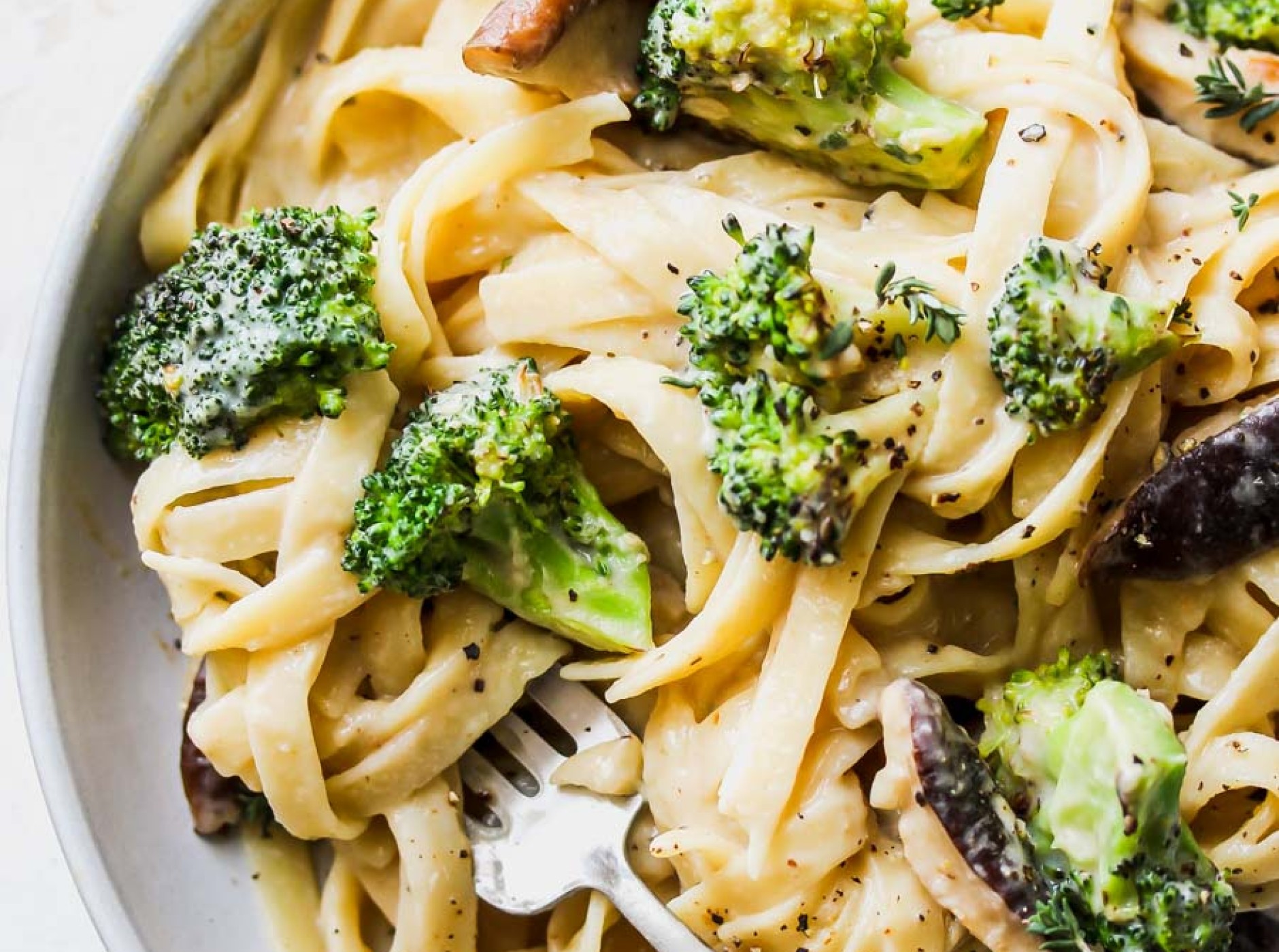 Season with the herbs and salt and pepper to taste. Turn off the heat. Wait for pasta to finish cooking and save a cup of cooking water.